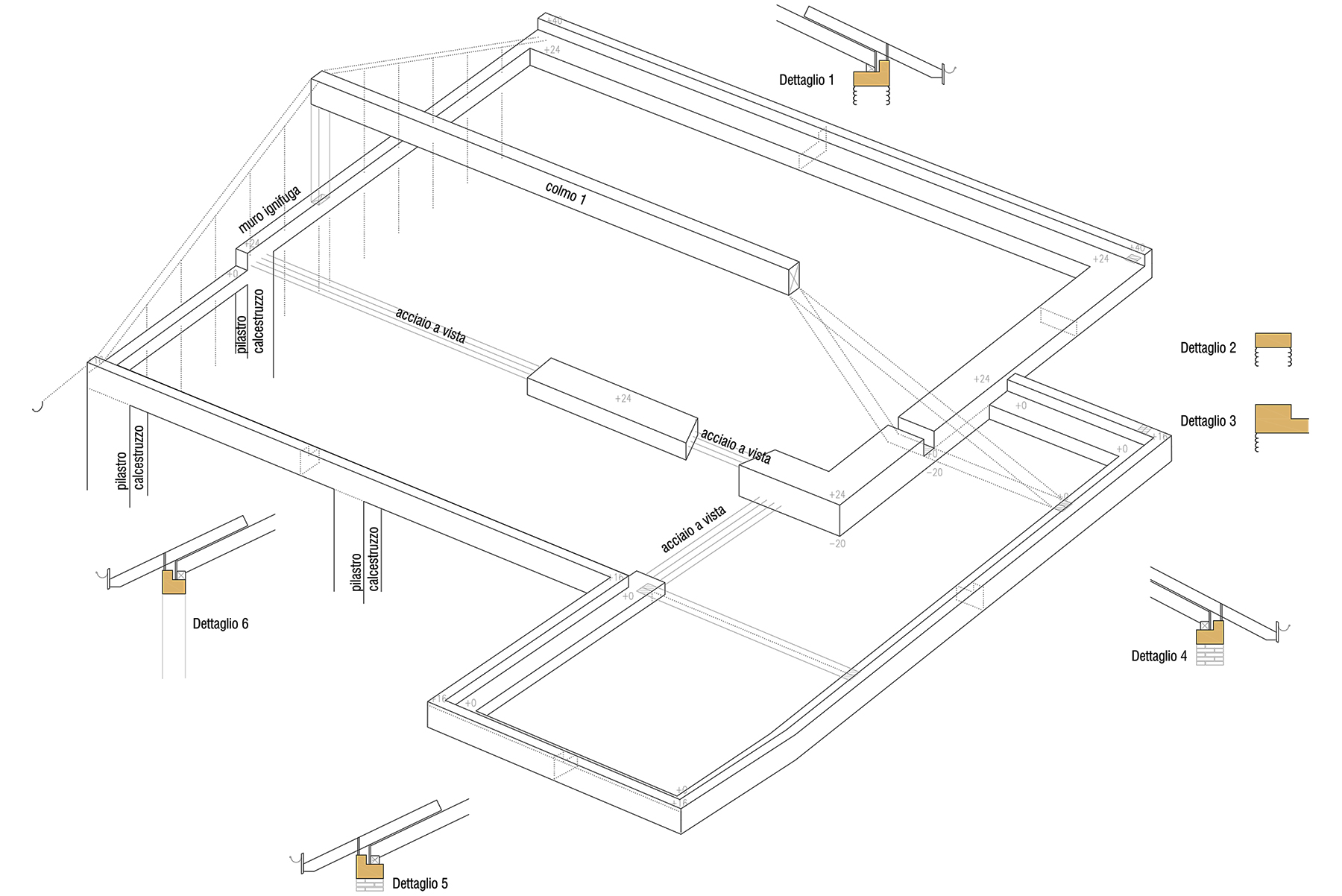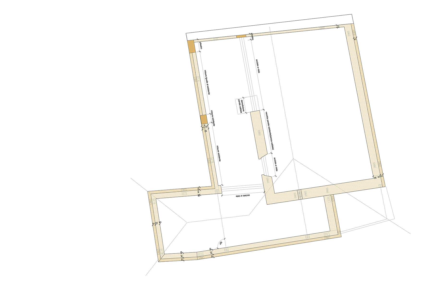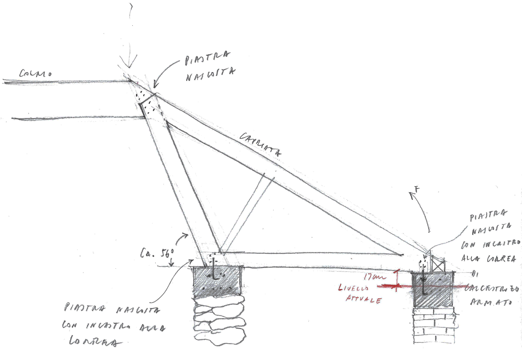 Also, not too long ago, the rustico was the place where the family kept their two cows, on the lower level, during the cold winter months. On the upper level, the necessary amount of hay was kept, to feed the animals below. On the restored house, the place where once hay was kept will become a small library and reading room. The weight of the Chestnut roof pressed down by the forces of gravity provided lateral stability to the otherwise fragile piles of dry-stacked stones. To replace the roof, a new yellow concrete tie-beam must be formed and poured as the stabilizing old roofs gets demounted. The new tie-beam will gently receive the new, insulated wood structure, while preventing any lateral movement of the masonry walls.